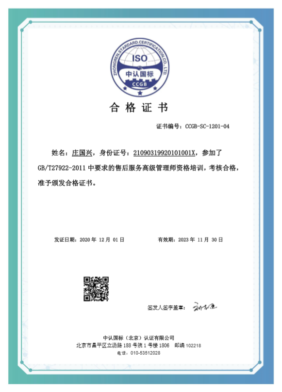 授予庄国兴售后服务高级管理师资格