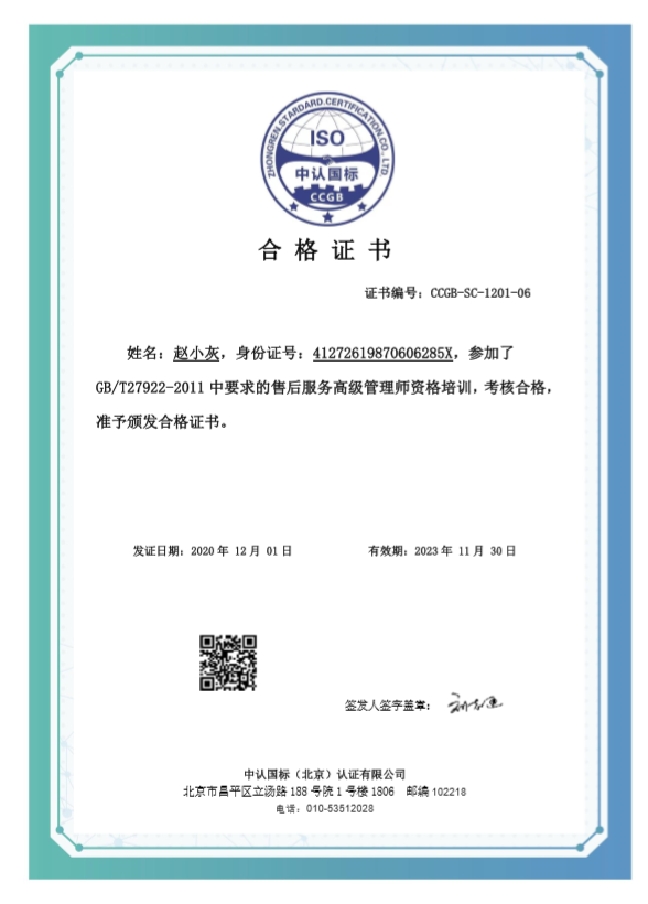 授予赵小灰售后服务高级管理师资格