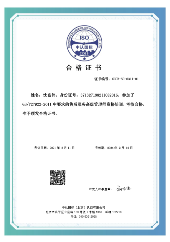 授予沈富伟售后服务高级管理师资格