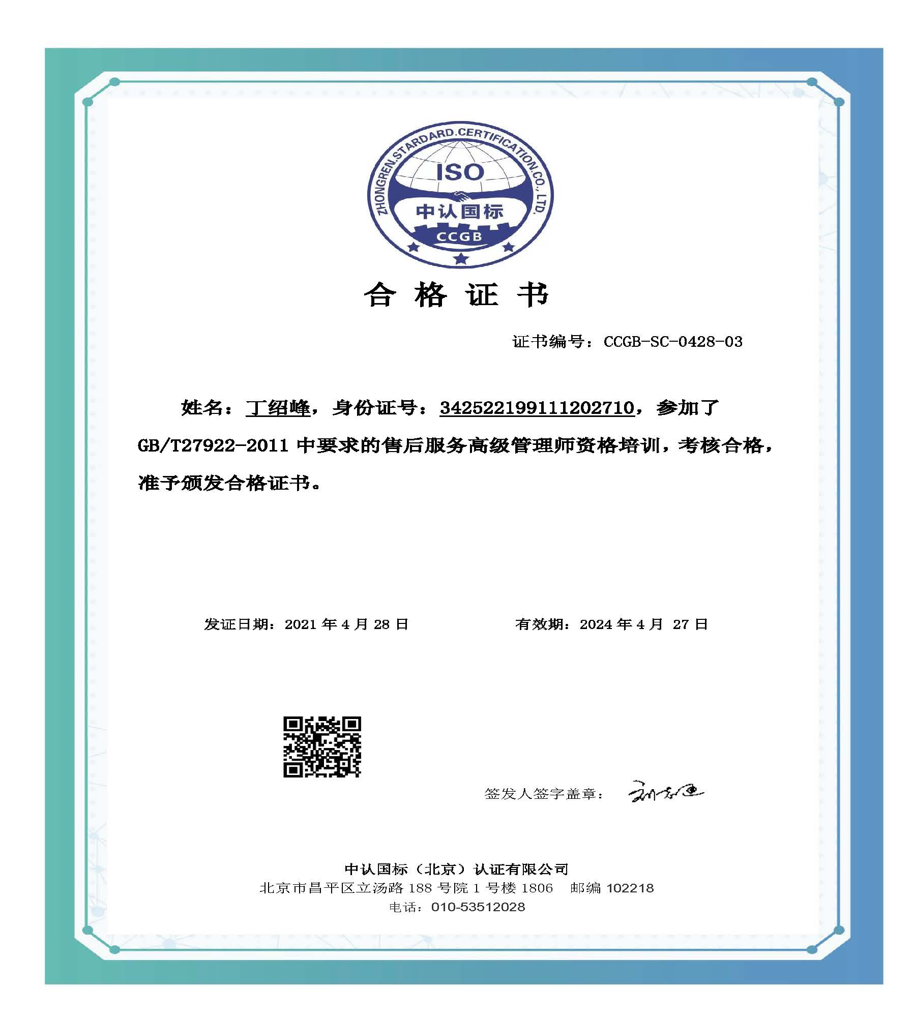 授予丁邵峰售后服务高级管理师资格