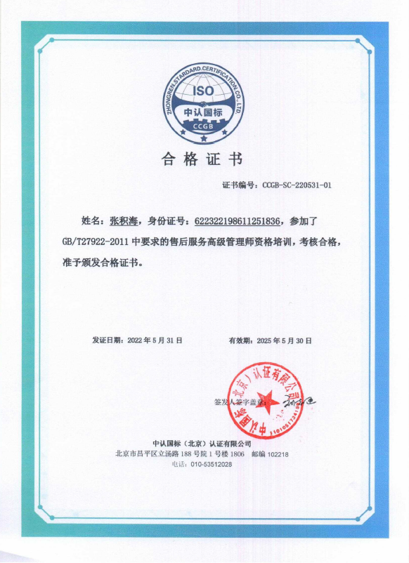 授予张积海售后服务高级管理师资格