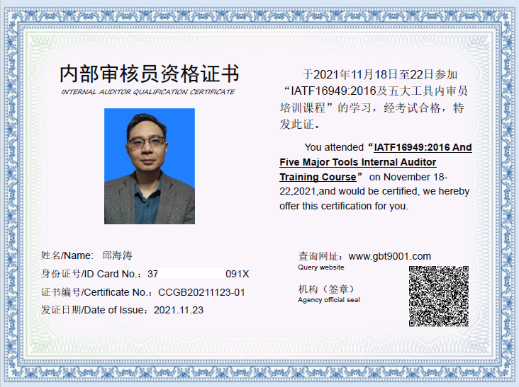 授予邱海涛内审员资格