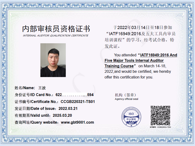 授予王波内审员资格