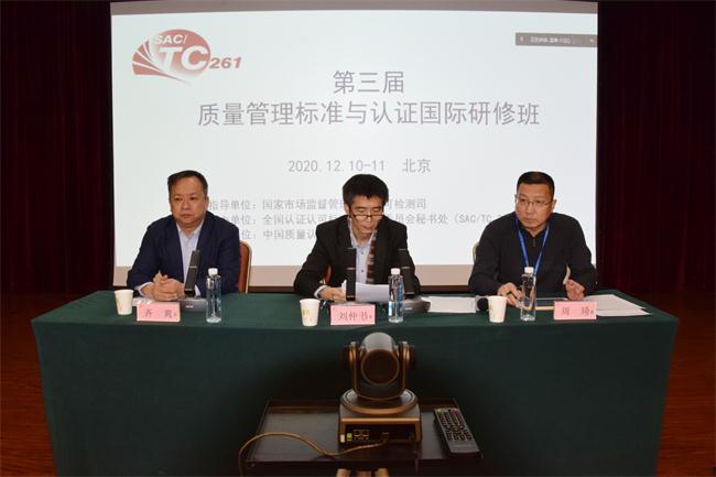 2020年12月10-11日,在市场总局认可检测司的 指导下,全国认证认可标准化技术委员会(SAC/TC261) 主办的“第三届质量管理标准与认证国际研修班”在北京 成功举办。市场监管总局认可检测司副司长刘仲书出席开班仪式并讲话,中国质量认证中心副主任齐爽为开班仪式致辞,开班仪式由中国认证认可协会(SAC/TC261秘书处承担单位)副秘书长周琦主持。